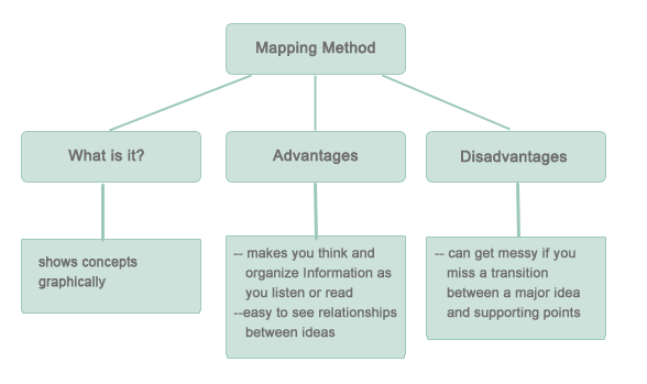The Mapping Method uses diagrams to record information. It is easy to note relationships among topics by using boxes, circles, lines, and arrows. During the lecture, this method can help you focus as you think of how to represent the information graphically.